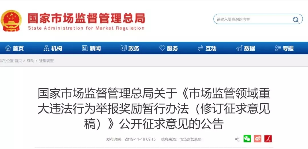 11月19日,国家市场总局印发了关于《市场监管领域重大违法行为举报奖励暂行办法(修订征求意见稿)》(以下简称“《办法》”)。