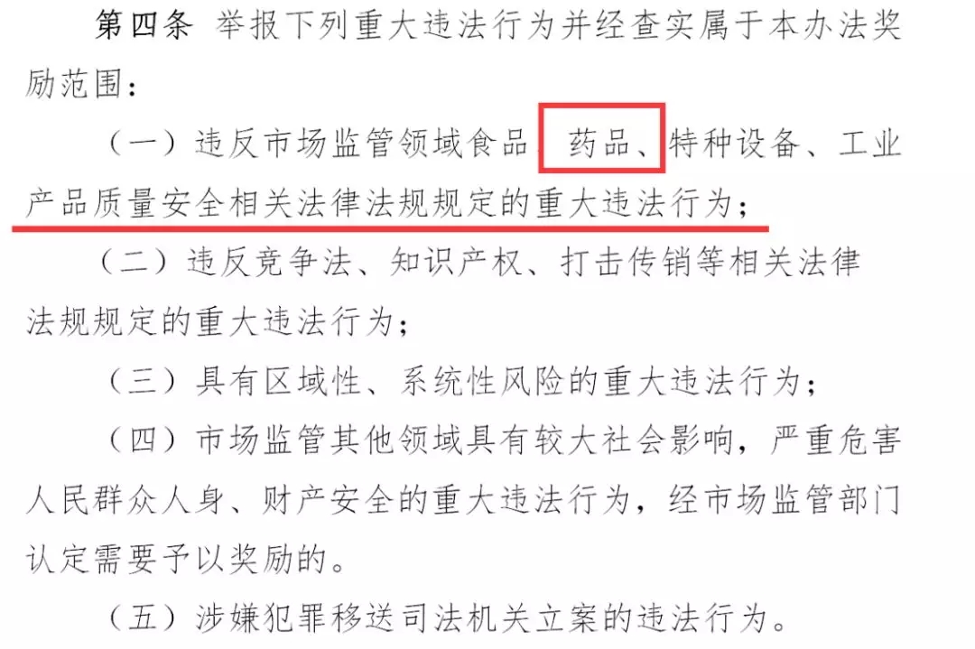 《办法》对于“举报重大违法行为并经查实属于奖励范围”的第一条明确指出,“违反市场监管领域食品、药品、特种设备、工业产品质量安全相关法律法规规定的重大违法行为”。