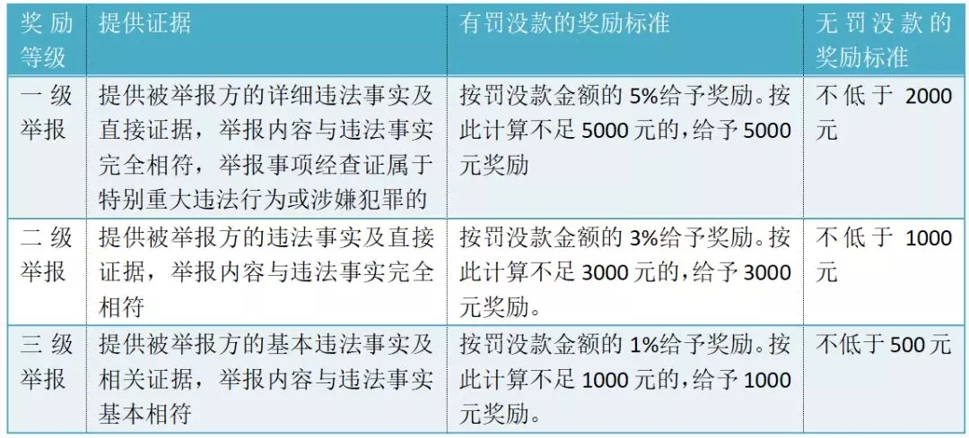 那么,举报人又会获得什么样的奖励呢?根据《办法》,举报奖励主要分为3个奖励等级,具体如下: