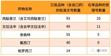 近年来随着抑郁症用药市场的高速发展,产品申报呈现繁荣的态势。根据我国CDE 数据显示,截至2019年11月25日,西酞普兰(含艾司西酞普兰)等抗抑郁药物的已批品种(含进口药)按批准文号和在审品种按受理号数量较多,见表3。