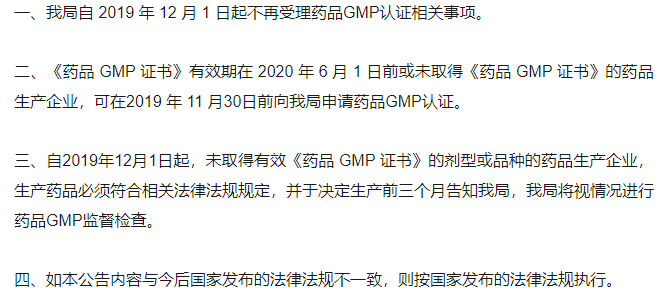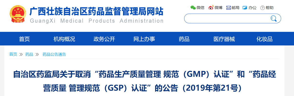 11月25日,广西自治区药监局发文,明确规定自2019年12月1日起,取消“药品生产质量管理规范(GMP)认证”和“药品经营质量管理规范(GSP)认证”行政许可事项,且不再受理相关申请。