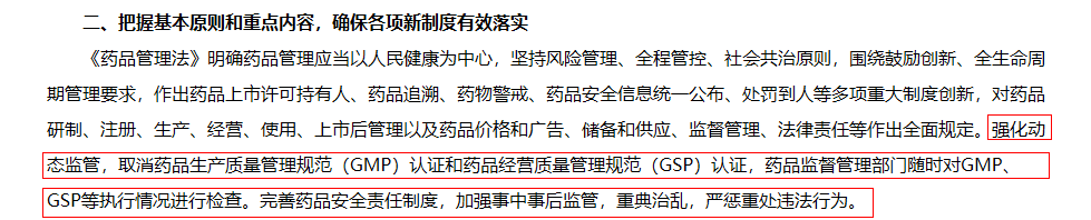 9月26日,国家药监局发布的《国家药监局关于学习宣传贯彻《中华人民共和国药品管理法》的通知(国药监法〔2019〕45号)》文中提到:强化动态监管,取消药品生产质量管理规范(GMP)认证和药品经营质量管理规范(GSP)认证,药品监督管理部门随时对GMP、GSP等执行情况进行检查。完善药品安全责任制度,加强事中事后监管,重典治乱,严惩重处违法行为。