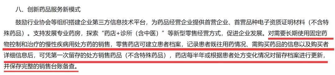 而且,该举措还谈到,“ 药品零售企业可采取复印、扫描、拍照等方式留存慢性病患者处方(病历),以后购买同一药品,可不再要求出示处方,购买数量不超过原处方(病历)载明的用量,如购买的处方药品发生变化时,应当要求患者重新提供医疗机构医师处方,特殊管理药品必须按规定销售。”
