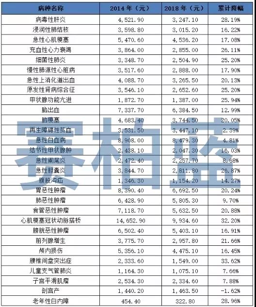 这29个病种中,除剖宫产年均药费在2014-2018年期间略有上升外,绝大多数病种的药费也有不同程度的下降。其中,腰椎间盘突出症和心肌梗塞冠状动脉搭桥药费累计降幅在30%以上,其余大多也在20%以上。