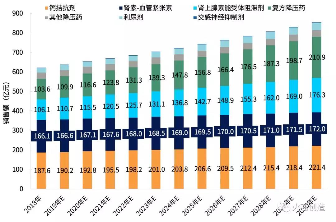 尽管我国高血压患者数量不断增长,但在药品价格不断下降的大背景下,降压药整体市场规模增速将呈现平稳缓慢态势。根据样本医院降压药销售数据测算,2018年我国降压药物物市场规模约621亿元,同比微增3.6%。