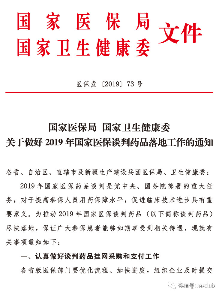 据 MRCLUB 网友反馈,12月16日,国家医保局、国家卫生健康委已经联合下发《关于做好 2019 年国家医保谈判药品落地工作的通知》(后附扫描版),要求各省级医保部门按照规定的时限将 97 个谈判药品在省级药品集中采购平台上直接挂网,同时,要保证新版目录及时落地。