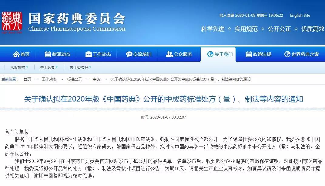 1月7日,国家药典委员会官网发布《确认拟在2020年版《中国药典》公开的中成药标准处方(量)、制法等内容的通知》(以下称《通知》)称,为了保障社会公众的知情权,其按照《中国药典》2020年版编制大纲的要求,经组织专家研究,除国家保密品种外,拟对《中国药典》一部收载的中成药标准中未公开处方(量)与制法的,全部予以公开。