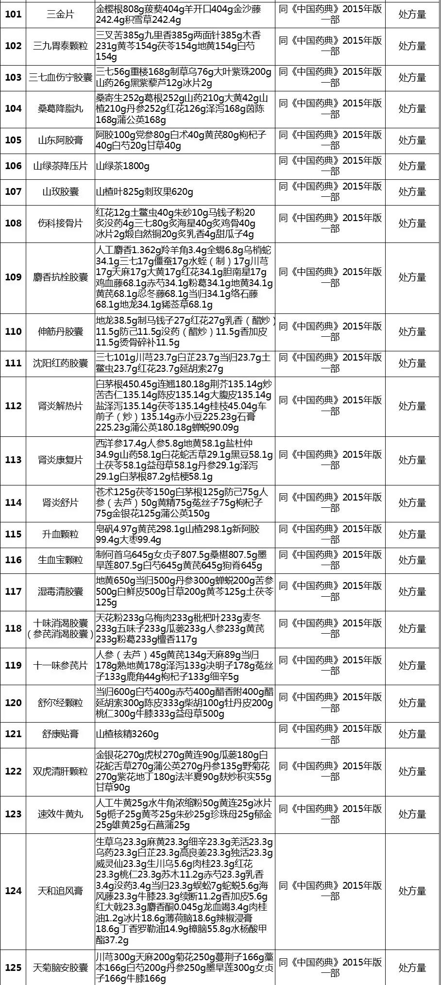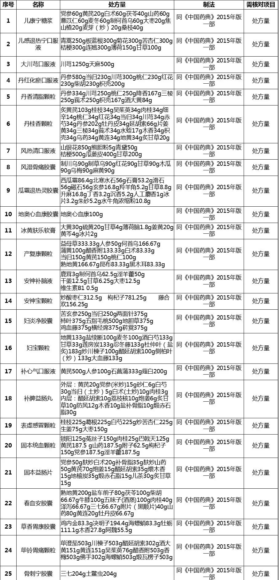 经梳理,该表共涉及255个中成药品种,除5个品种在2020版《中国药典》修订时已单独进行公示、2015年版《中国药典》【制法】中已包含处方量或不需要补充处方量外,其余250个品种均有新公开的处方量或制法的相关信息。