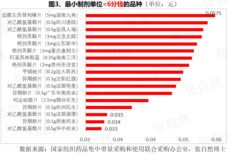 本次中选单价最小的是华中药业的对乙酰氨基酚片(0.5g),单价为3分钱(即0.033元/片)(图3),比4+7的0.148元/片(浙江京新的苯磺酸氨氯地平5mg)和4+7扩围的0.049元/片(齐鲁制药的利培酮1mg)又降低了很多,尤其低于6分/片的就有17个,比4+7及扩围的最低单价品种数量多出更多。