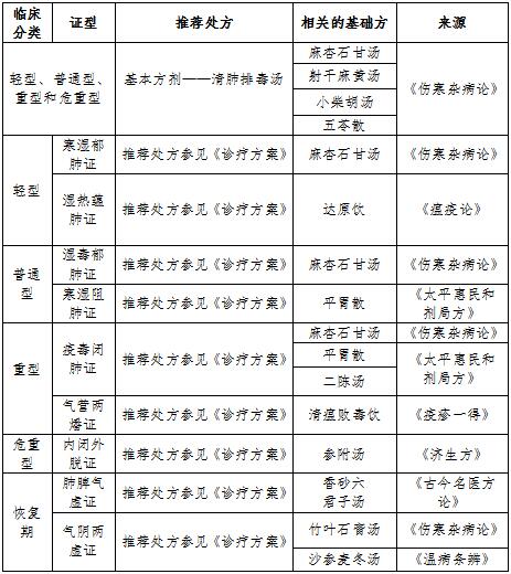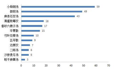 对于临床治疗期的推荐处方,《诊疗方案》给出了10首推荐处方(其中1首基本方剂)和8个中药注射剂,报告通过分析基本方剂和各推荐处方的组方架构,发现其基础方分别源自12首中医古代经典方,也就是说这些推荐处方均为根据中医经典方演化而成。