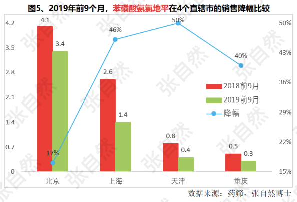 通过分析氨氯地平在京津沪渝4个直辖市的销售情况,可以发现,2019年前9个月的销售额较上年同期都出现了下降,其中天津降幅最大,下降了一半,北京降幅最小,只下降了17%。