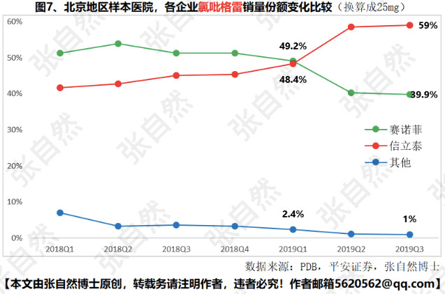 同样是在北京样本医院,氯吡格雷的原研品波立维(赛诺菲)长期占据市场份额第一的位置,4+7试点由信立泰的泰嘉中标,故从2019年一季度末4+7试点实行半年后,波立维的市场份额由第一季度的49.2%下降到了3季度末的39.9%,下降了9个百分点,而中选品种泰嘉的份额则由一季度的48.4%迅速上升到了三季度的59%,上升了10.6个百分点。