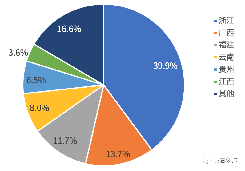 浙江省是我国实现铁皮石斛人工培育种植最早的省份,早在上世纪90年代,浙江省就率先实现了铁皮石斛的规模化种植和产业化开发,根据火石创造数据库显示,当前全国铁皮石斛种植加工企业共1377家,其中浙江省549家,占39.9%。