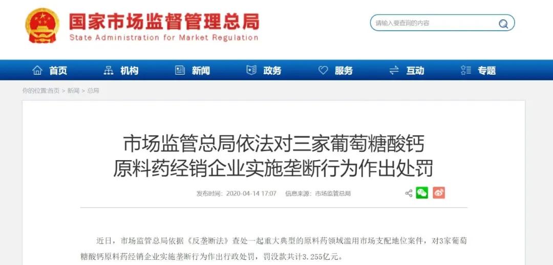 2019年初,市场监管总局接到举报,反映有医药经销企业垄断注射用葡萄糖酸钙原料药,造成葡萄糖酸钙注射液供应短缺,价格大幅上涨,涉嫌违反《反垄断法》。