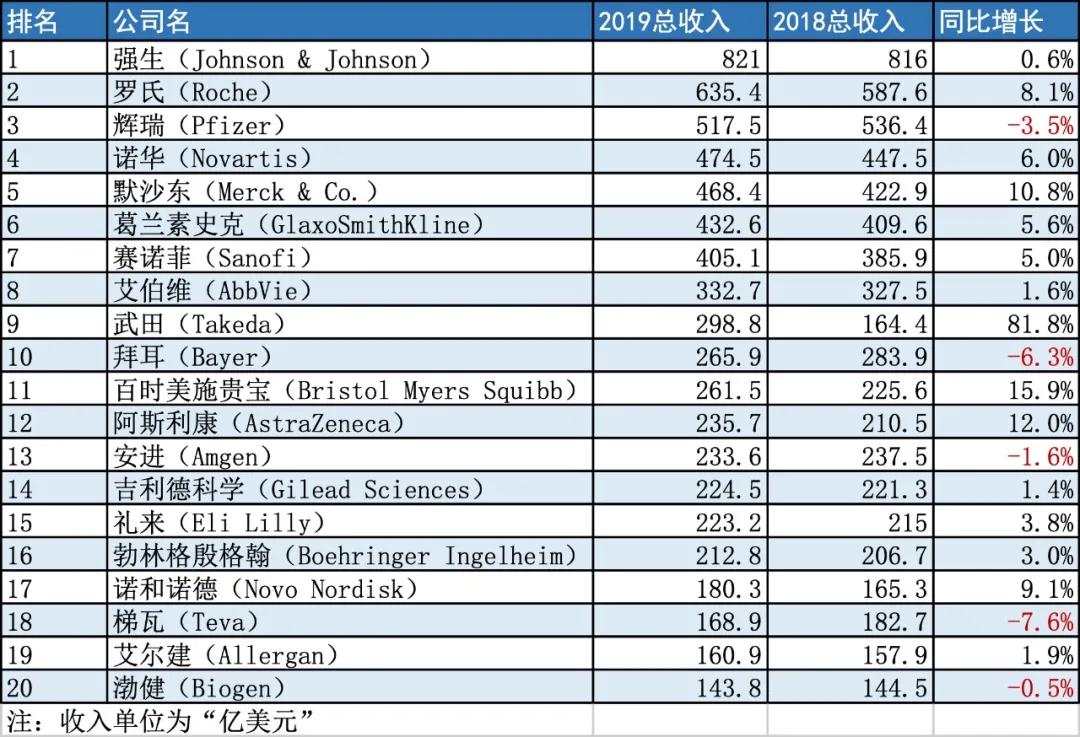 2019年全球制药企业营收Top 20